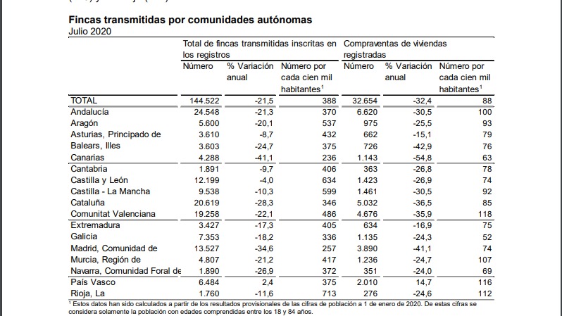 Los últimos datos del Instituto Nacional de Estadística (INE) muestran que la compraventa de viviendas ha caído un 41,1% interanual en la Comunidad de Madrid (julio 2020- julio 2019). Casi diez puntos porcentuales por encima de la media nacional que es de un 32,4%. Hablamos de datos interanuales. Sin embargo, la actividad se ha incrementado de manera importante en julio de este año respecto al mes anterior.