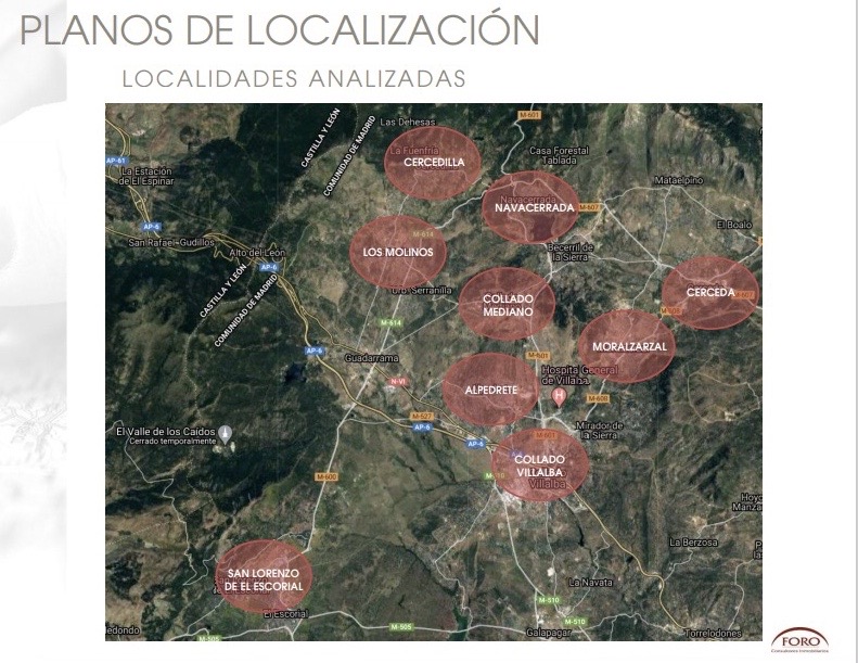 Foro Consultores ha realizado un estudio de vivienda unifamiliar en diversas localidades de la sierra de Madrid (que se pueden ver en el plano de abajo) y la conclusión es clara. A pocos kilómetros de las grandes ciudades se pueden comprar vivienda muchos más grandes y más baratas.