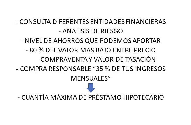 Al contrario de lo que mucha gente cree, lo primero que yo aconsejo es ponerse en contacto con distintas entidades financieras. A través de las mismas y un breve análisis de riesgo, sabremos respondiendo a un breve cuestionario, cuál sería el máximo de préstamo hipotecario que la entidad estaría inicialmente dispuesta a concedernos. En términos generales, el banco verá con buenos ojos una estabilidad laboral, y que aportemos parte del importe de compra de nuestros ahorros, y es por eso por lo que solo nos concederá hasta el 80 % del valor más bajo entre el precio de compraventa y el valor de tasación.