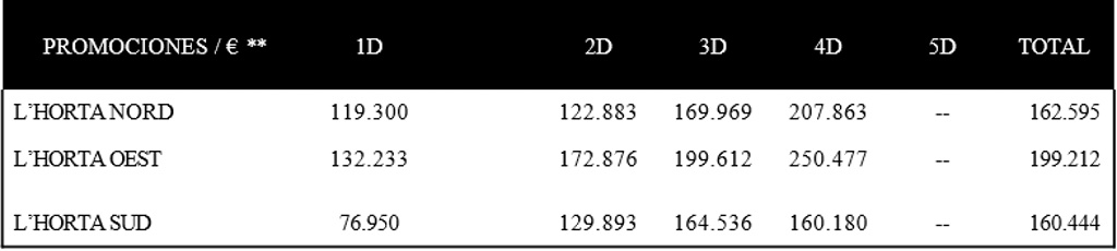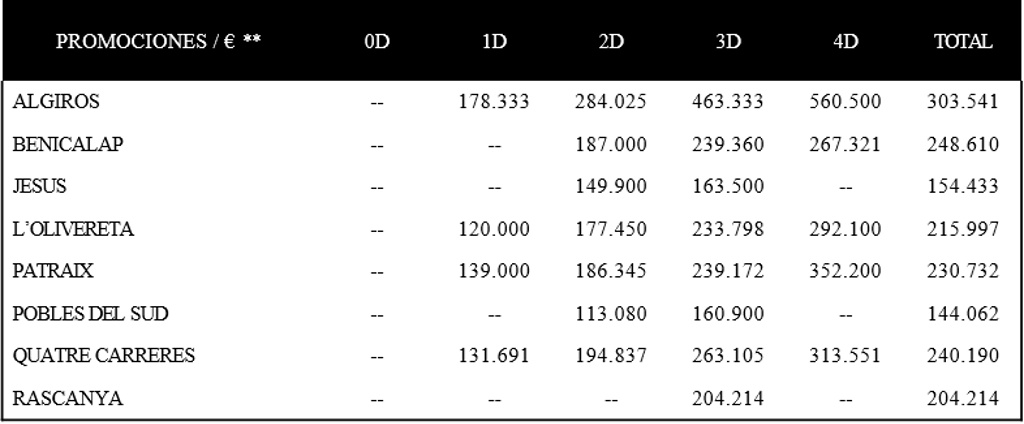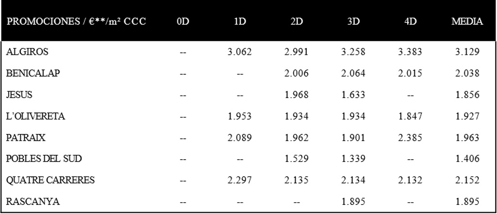 Respecto a los precios medios absolutos, se mueven en un rango de 144.000 a 300.000 euros. En cuanto a los precios medios por metro cuadrado, oscilan entre los 1.400 y los 3.100 euros por metro cuadrado construido (m2ccc). En el estudio no se ha incluido los proyectos de Campanar, dado que los precios están por encima de los 3.500 y a veces de los 4.000 euros metro cuadrado y está orientado a un público objetivo diferente al resto de las áreas analizadas, ni tampoco zona Centro.