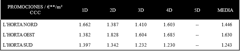 *€/m2 CCC. Euros metro cuadrado construido con comunes. Todas las medias están ponderadas por el stock disponible en cada tipología.