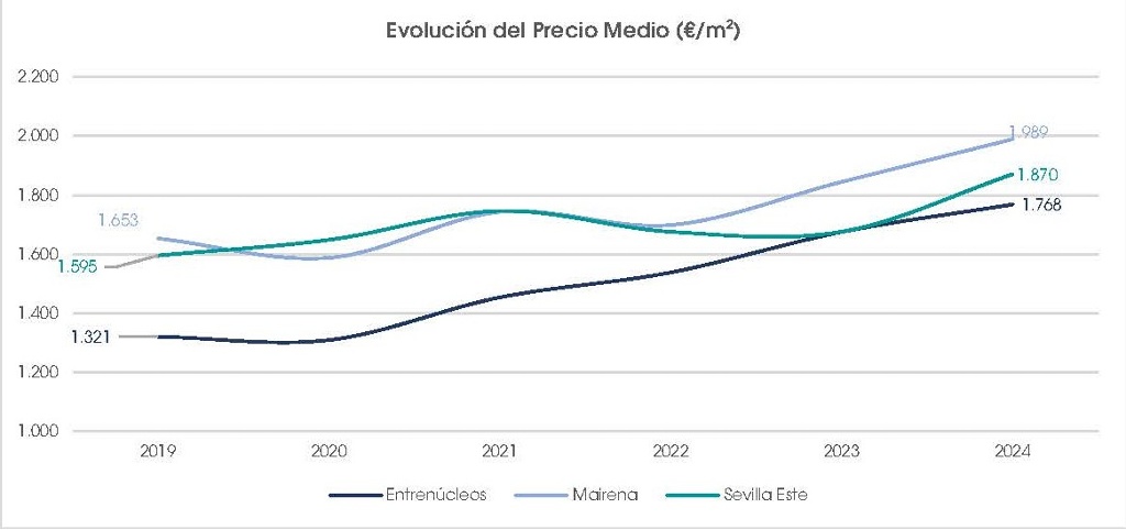 El crecimiento de precios es acusado todos los años, salvo en 2020 donde los precios se mantuvieron e incluso descendieron por la paralización casi total del mercado. El precio medio en valores absolutos se ha incrementado un 28 % en los últimos cinco años en Entrenúcleos, y un 20 % en Mairena y Sevilla Este. Mairena cuenta con los pisos más caros, 219.000 euros de media, le sigue Sevilla Este con 207.600 y Entrenúcleos con 191.000 euros.