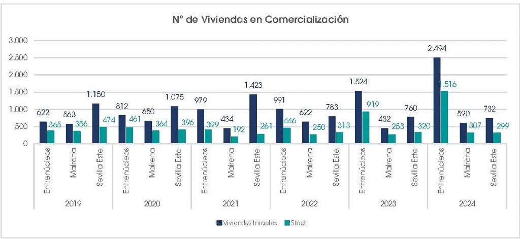 En el año 2024 se alcanza el máximo de viviendas en comercialización en estos tres ámbitos, con un total de 3.816 unidades iniciales. Y el stock de viviendas por vender también alcanza máximos, con 2.122 viviendas, un 55 % de las viviendas iniciales.