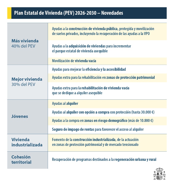 El Gobierno ha presentado las líneas estratégicas del Plan Estatal de Vivienda 2026-2030, dotado con 7.000 millones de euros: 60% aportado por el Estado y 40% por las comunidades autónomas, responsables de la competencia en vivienda.