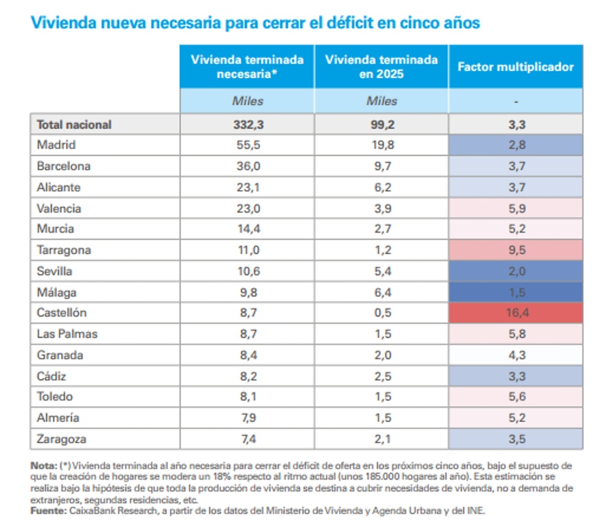La vivienda nueva necesaria para acabar con el déficit en cincos años sería de más de 330.000 viviendas, pero en 2025 solo finalizaron 99.000. En el caso de Madrid se terminaron unas 20.000 viviendas durante el paso año, mientras que las necesidades superaban las 55.000. Pero hay ciudades donde la situación es peor, es el caso de Castellón o Tarragona donde apenas se hacen viviendas nuevas.